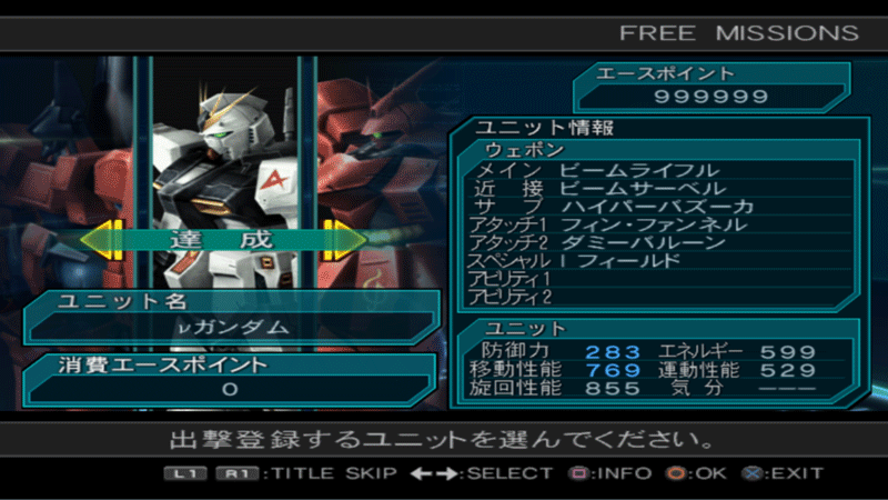 The SELECT UNIT features most of Gundam Wing's ACEs mobile suits. It also features Nu Gundam, Sazabi from Char's Counter Attack, Zeta Gundam, Hyaku Shiki from Z Gundam.